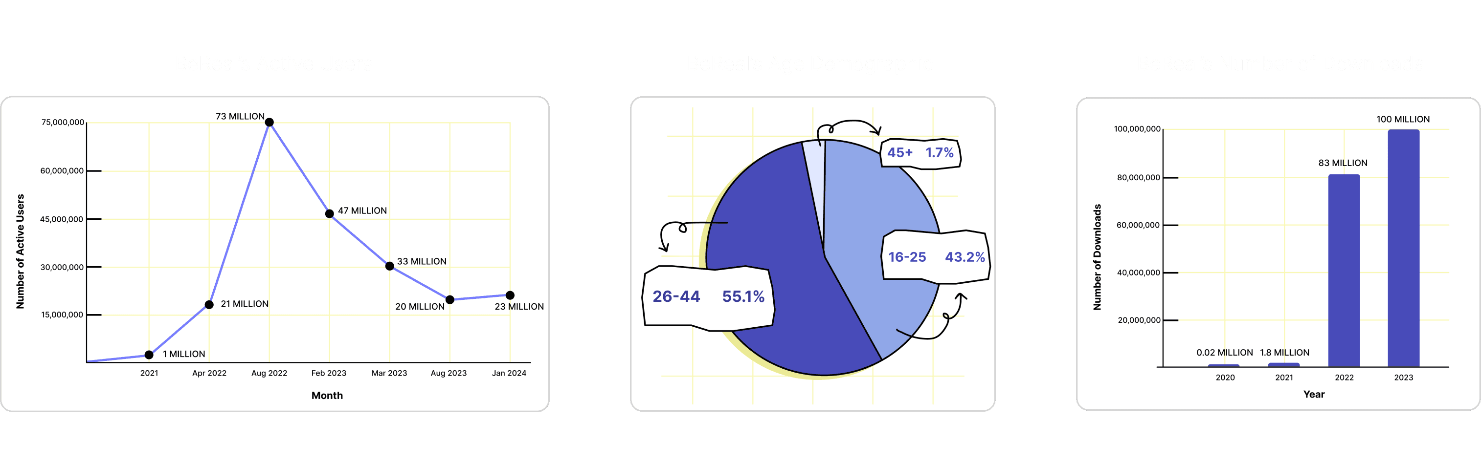 This project was open-ended to begin with. After conducting online research in BeReal's philosophy and trends overtime, I found pretty shocking numbers. BeReal's active users skyrocketed to ~73 million users in August 2022 and has since dramatically plateaued to ~23 million users in just over a year.
