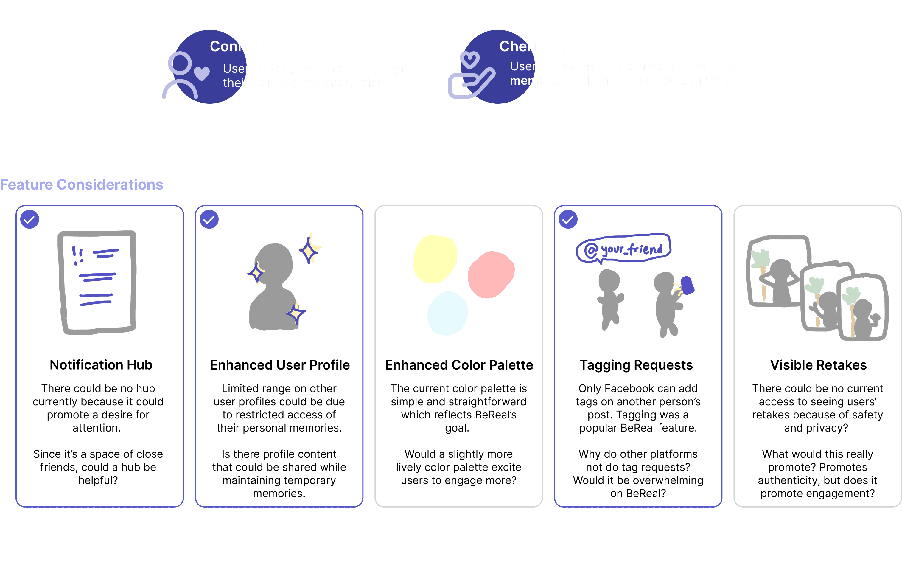 I ideated new solutions that kept this aspect of a playful feature that could deepen 1:1 connections without promoting a curated reality.