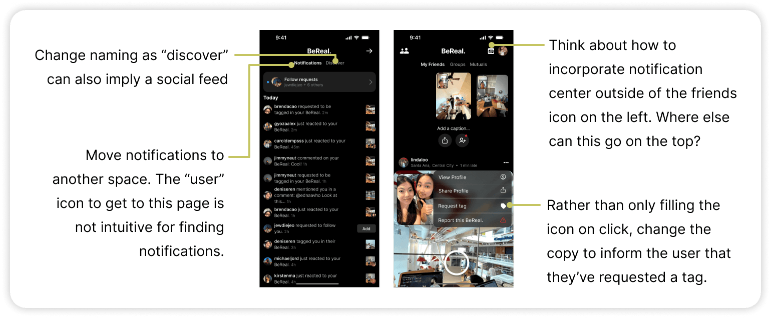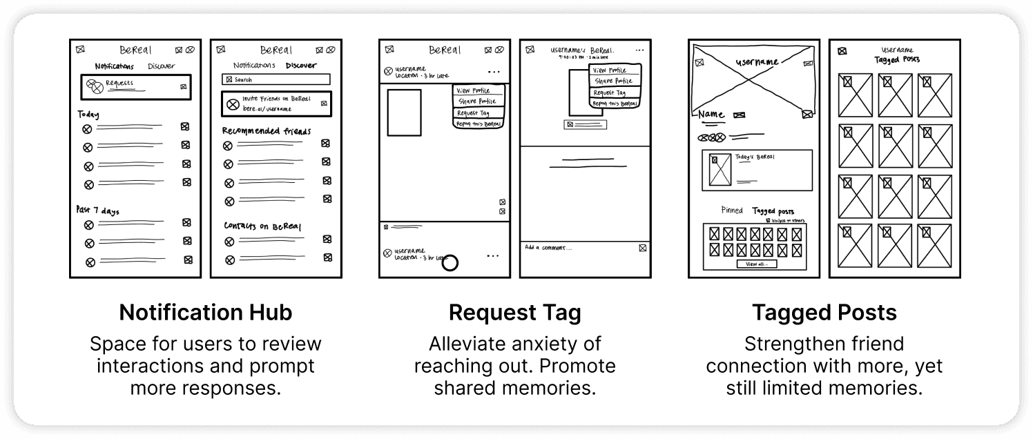 I had decided to go forth with designing a new notification hub to help promote shared interactions, request tag to encourage shared moments through a streamlined process, and tagged posts to help deepen friendships on BeReal. After developing mid-fi's, I conducted 2 live interviews for feedback.