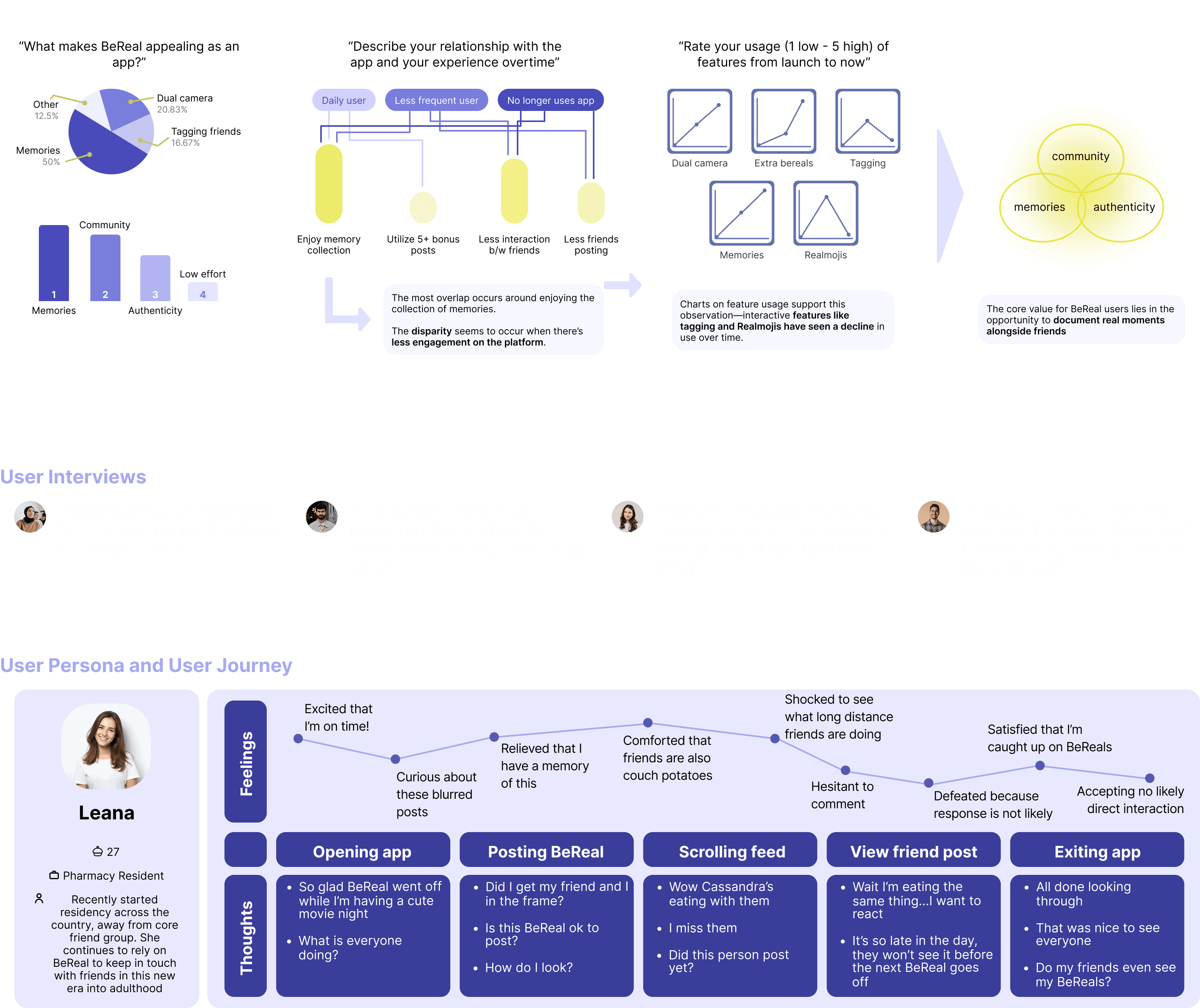 I conducted user research by conducting live interviews with 8 users and dispersing a Google Form to 24 users with diverse BeReal experiences with an aim to now gain more context into what motivates them to stay and/or leave the platform. After synthesizing the data, I noticed a trend: recording memories was a core value for BeReal users, but user retention was higher when those memories were celebrated with friends.