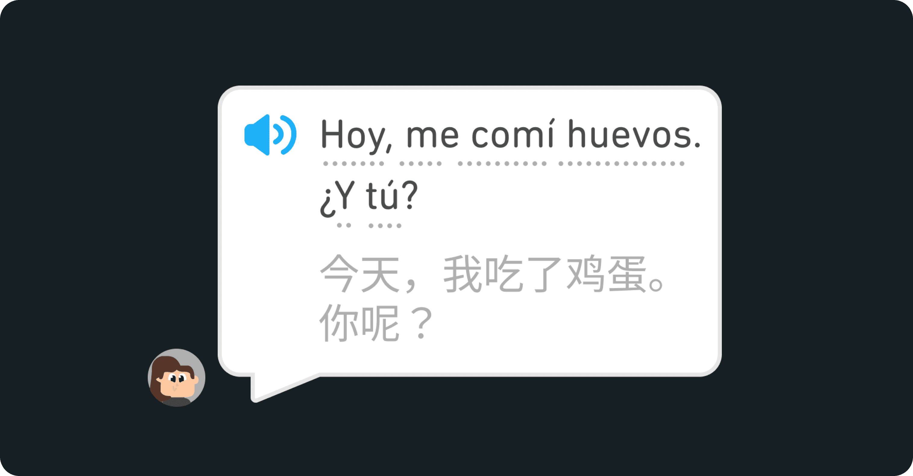 Grey text indicates the learner’s target language, while contextual translation logic preserves idioms and intent rather than relying on direct word-for-word translation.